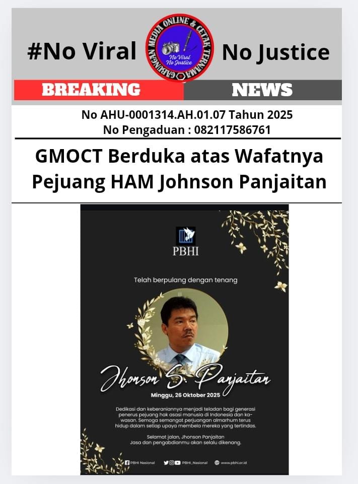 Sekretaris Jenderal GMOCT, Asep N. S., menambahkan, “Almarhum Johnson adalah figur langka—tegas, jujur, dan selalu berpihak pada korban. Kami di GMOCT turut berbelasungkawa sedalam-dalamnya. Warisan perjuangannya akan selalu hidup di hati mereka yang memperjuangkan kebenaran.”