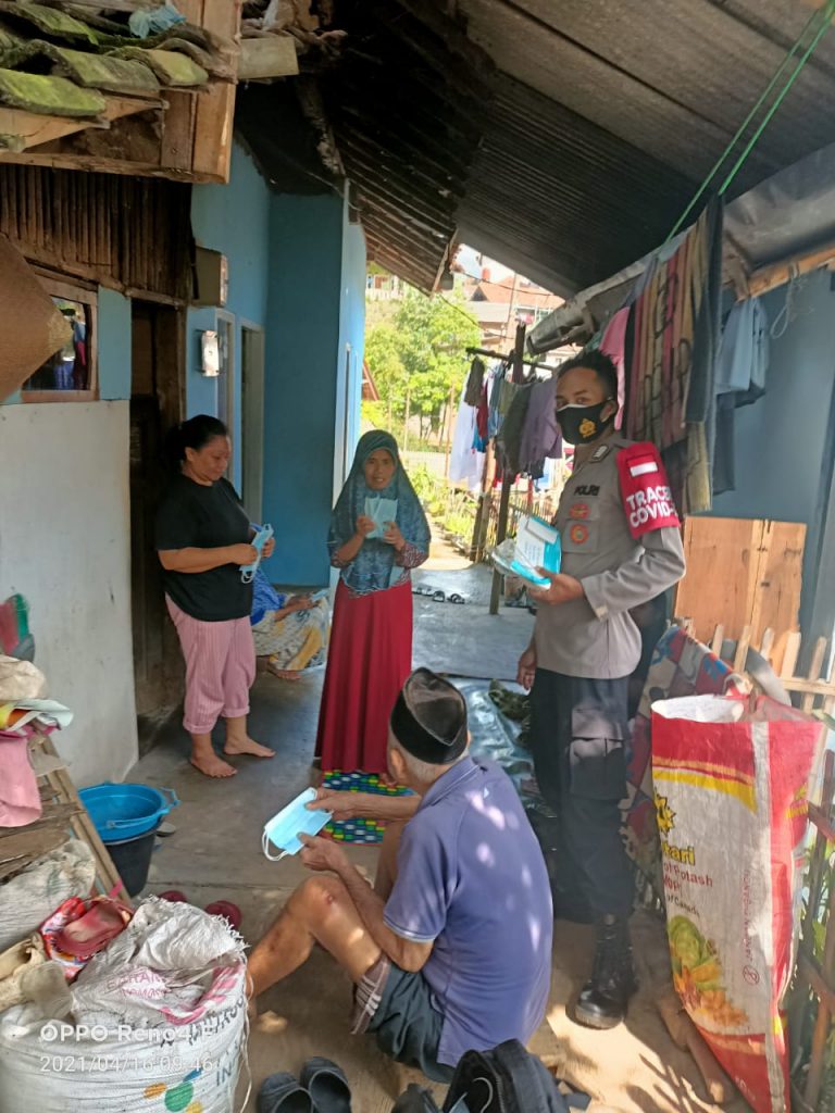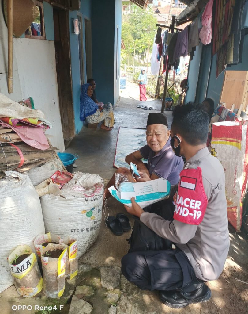 Bhabinkamtibmas Polsek Pacet Polresta Bandung Polda Jabar Ds Sukarame Bripka Ari Dinar Primaji membagikan masker kepada warga secara door to door dalam rangka untuk mencegah penyebaran Virus Corona (Covid-19).