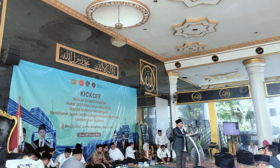 Penajournalis.com KARAWANG, JAWA BARAT – Kementerian Agama Republik Indonesia (Kemenag RI) melalui Direktorat Jenderal Bimbingan Masyarakat Islam (Bimas Islam) secara resmi menggelar Kick Off Program Masjid Ramah Pemudik Natal 2025 dan Tahun Baru 2026 (Nataru) dengan tema “Masjid Berdaya Berdampak” di Masjid Jami’ An-Nur, Kelurahan Tanjung Mekar, Kecamatan Karawang Barat, Kabupaten Karawang, Selasa (23/12/2025).