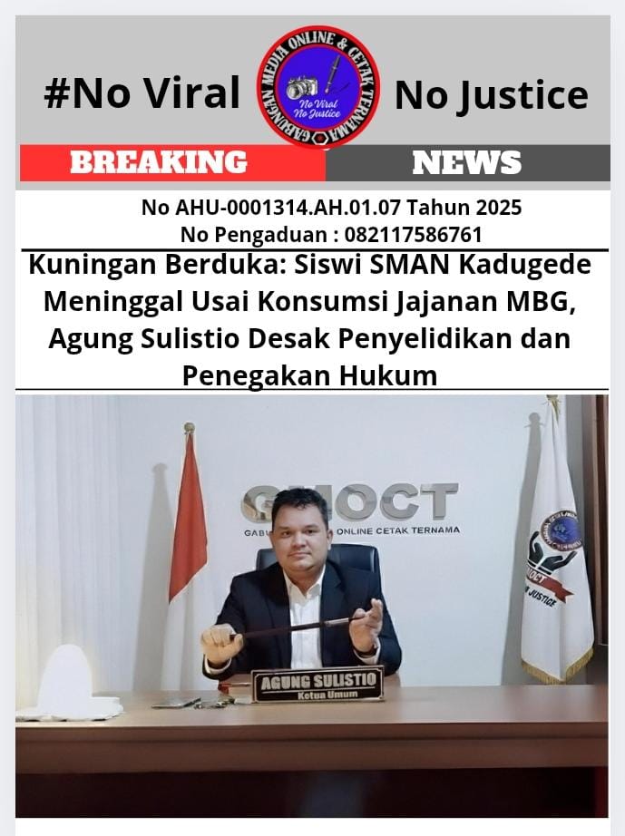 Penajournalis.com Kuningan (GMOCT) – Kabar duka menyelimuti dunia pendidikan di Kabupaten Kuningan. Novi, seorang siswi kelas 3 SMAN Kadugede, meninggal dunia setelah diduga mengalami keracunan akibat mengonsumsi jajanan MBG (nama jajanan disamarkan). Peristiwa tragis ini terjadi pada Kamis, 16 Oktober 2025, dan langsung memicu reaksi keras dari berbagai pihak.