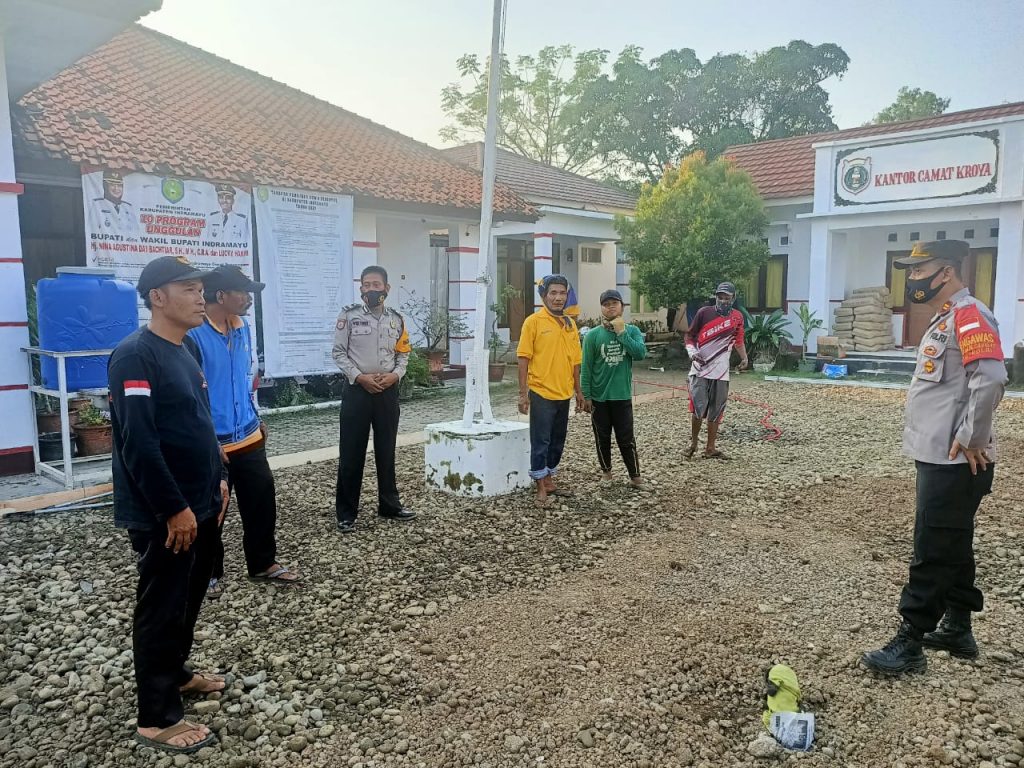 Dipimpin Kapolsek Kroya Iptu H. Rasita, SH., diikuti Anggota kegiatan tersebut dilaksanakan di Depan kantor Kecamatan Kroya, Kabupaten Indramayu.