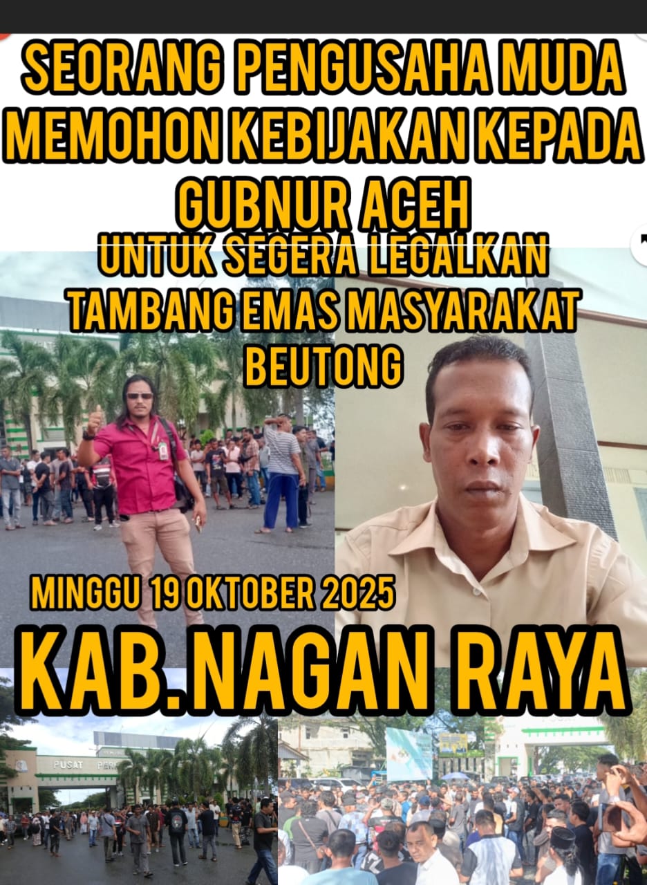 Penajournalis.com Nagan Raya, 19 Oktober 2025 – Suara hati rakyat kecil kembali bergema dari pedalaman Kecamatan Beutong, Kabupaten Nagan Raya. Seorang penambang emas muda mewakili para pekerja tambang tradisional menyampaikan desakan tegas kepada Gubernur Aceh agar segera mengambil langkah nyata dalam melegalkan aktivitas tambang emas rakyat yang selama ini menjadi sumber penghidupan warga.
