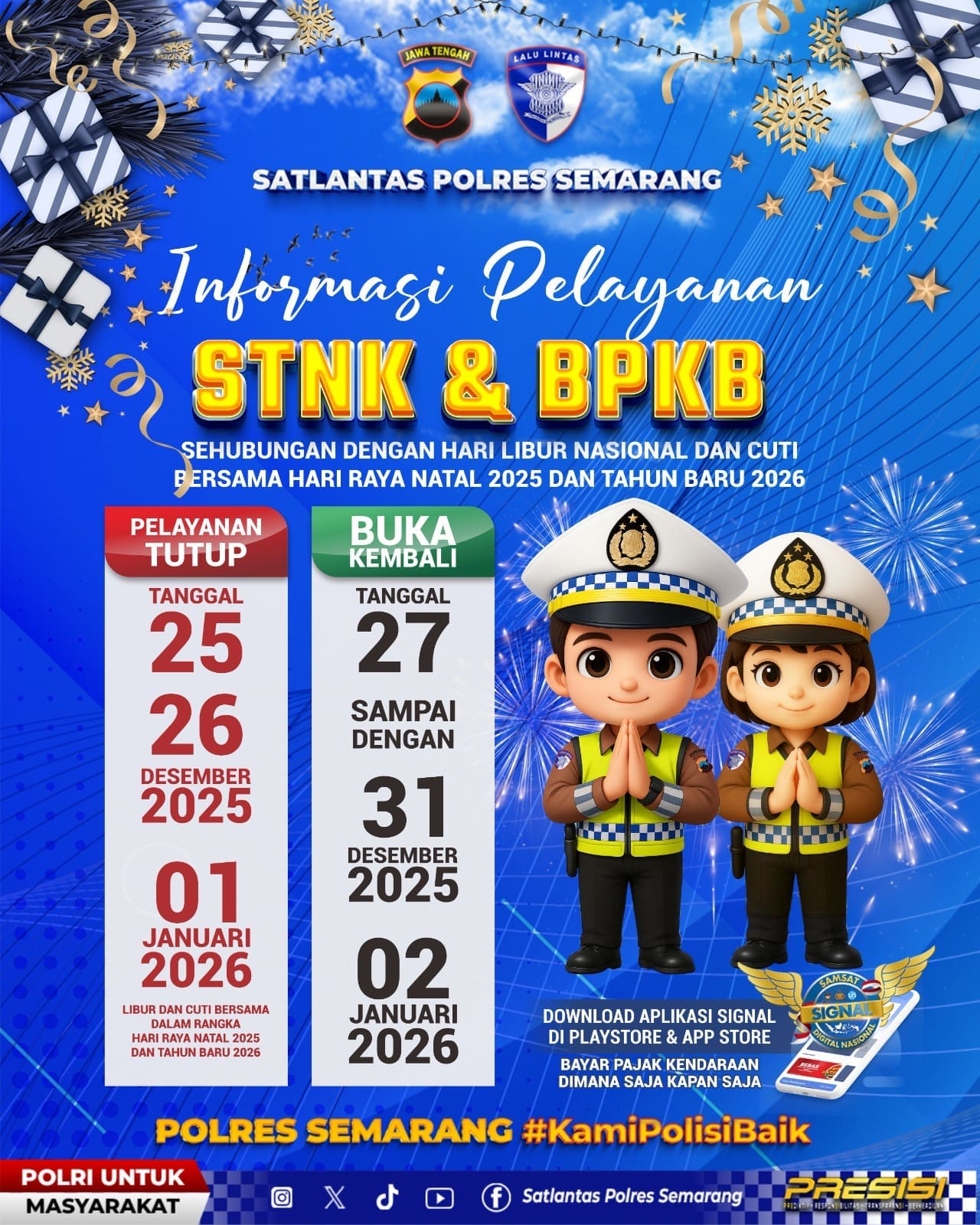 Penajournalis.com Semarang – Satuan Lalu Lintas (Satlantas) Polres Semarang mengumumkan informasi terkait jadwal pelayanan Surat Tanda Nomor Kendaraan (STNK) dan Buku Pemilik Kendaraan Bermotor (BPKB) selama periode libur Natal 2025 dan Tahun Baru 2026. Pengumuman ini bertujuan untuk memberikan kejelasan kepada masyarakat terkait operasional pelayanan selama masa libur.
